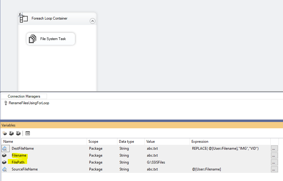 Filename : This variable is used for Dynamically getting the Filename in SSIS For Each Loop container. We need to set some default name (abc.txt) so that it will create failure in build.